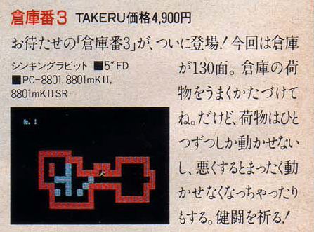 One example of vaporware I consider is 倉庫番3 (Sokoban 3). This game, featuring 130 puzzles for the PC-8801, was announced in the Japanese magazines MSX Magazine (August 1986, page 22), Micom BASIC (October 1986, page 20), and LOGiN Magazine (October 1986, page 40), with plans to distribute it on a floppy disk via Takeru vending machines.