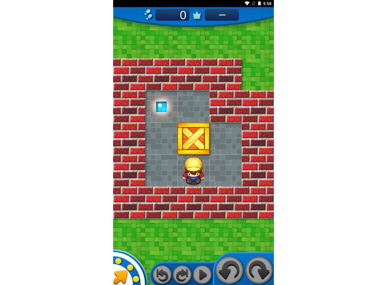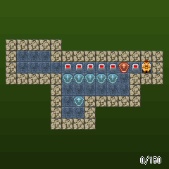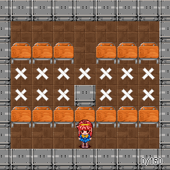 Boxes are heavy and can only be pushed one square forward if directly in front of the player, and the space directly beyond the box is free of obstacles (a wall or another box). Boxes cannot be pulled or lifted, and only one can be pushed at a time.