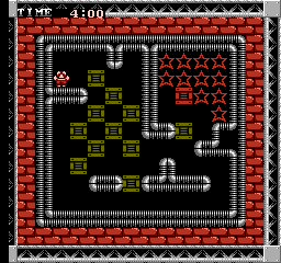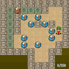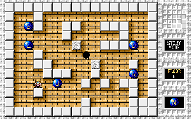 Push balls into the target square. L, U, R, and D balls shift gravity when they fall, moving other balls automatically and preventing the player's movement in the opposite direction; N resets gravity, and B explodes along with weaker wall tiles on contact.